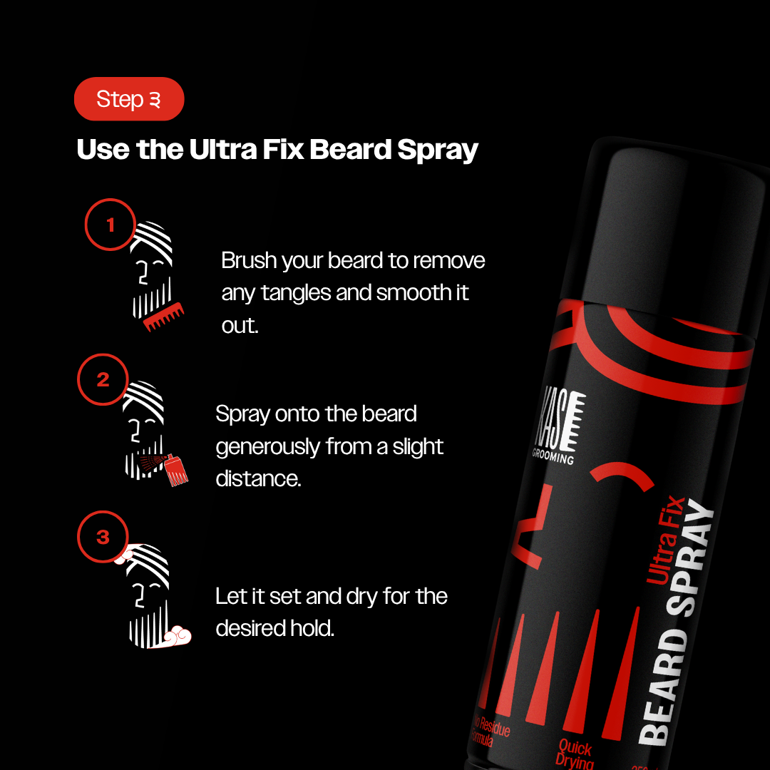 - Ultra Fix Beard Spray (250 ml): No-residue, quick-drying beard-setting spray that holds your beard and hair in place.